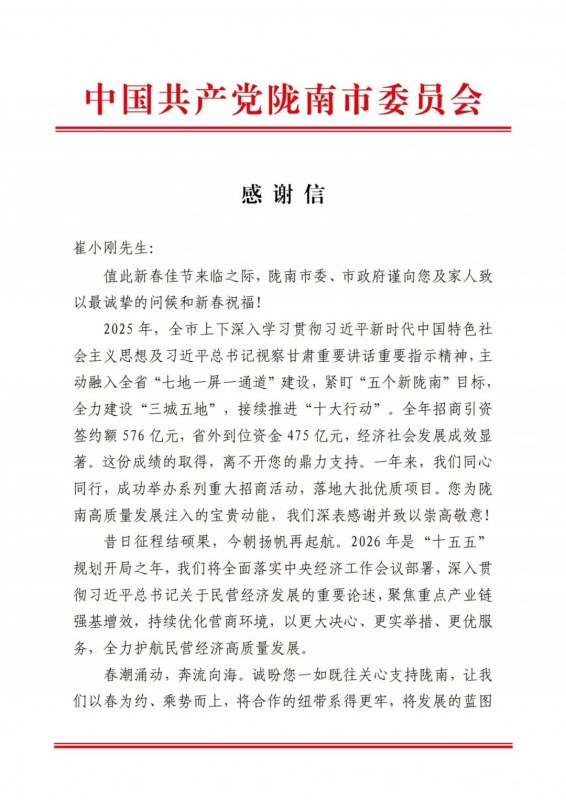 新春佳节来临之际,中共陇南市委、市政府向我会书记、会长崔小刚发来感谢信,对其长期助力陇南发展表示衷心感谢。