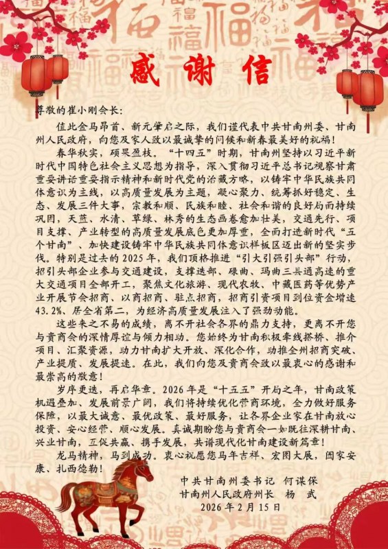 值此新春,中共甘南州委、州政府向我会书记、会长崔小刚发来感谢信,对商会长期助力甘南发展表示衷心感谢。