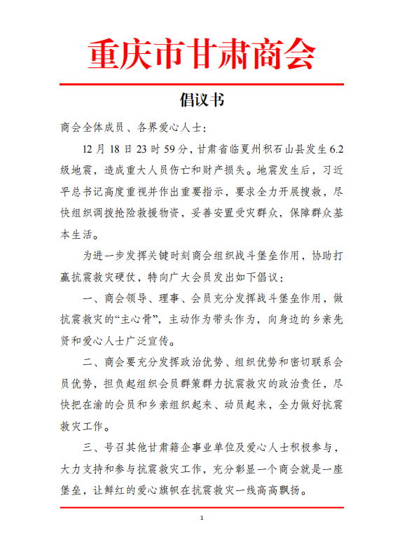面对突发灾情,重庆市甘肃商会迅速发出捐助倡议书,号召广大在渝陇籍民营企业家、同乡及社会各界爱心人士伸出援助之手、同舟共济,帮助受灾区域的人民群众渡过难关,为灾区群众送去绵薄帮助。