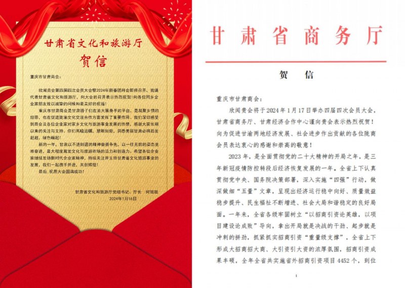 2024年1月17日晚上18:00,重庆市甘肃商会第四届四次会员大会暨2024年新春团拜会在渝北区皇庭御膳两江宴会中心顺利举行。