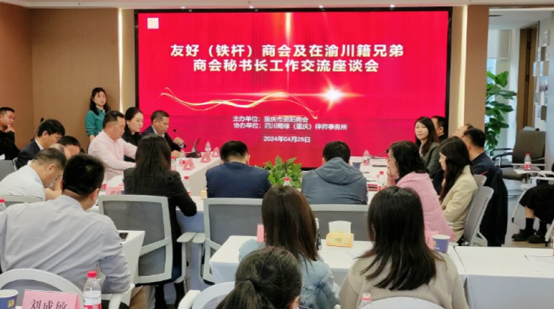 4月25日下午,由重庆市资阳商会承办的友好(铁杆)商会及在渝川籍兄弟商会秘书长工作交流会在蜀缘(重庆)律师事务所成功举行。友好商协会秘书长、企业代表共计50余人参加座谈交流,重庆市资阳商会秘书长李秋主持交流座谈会。